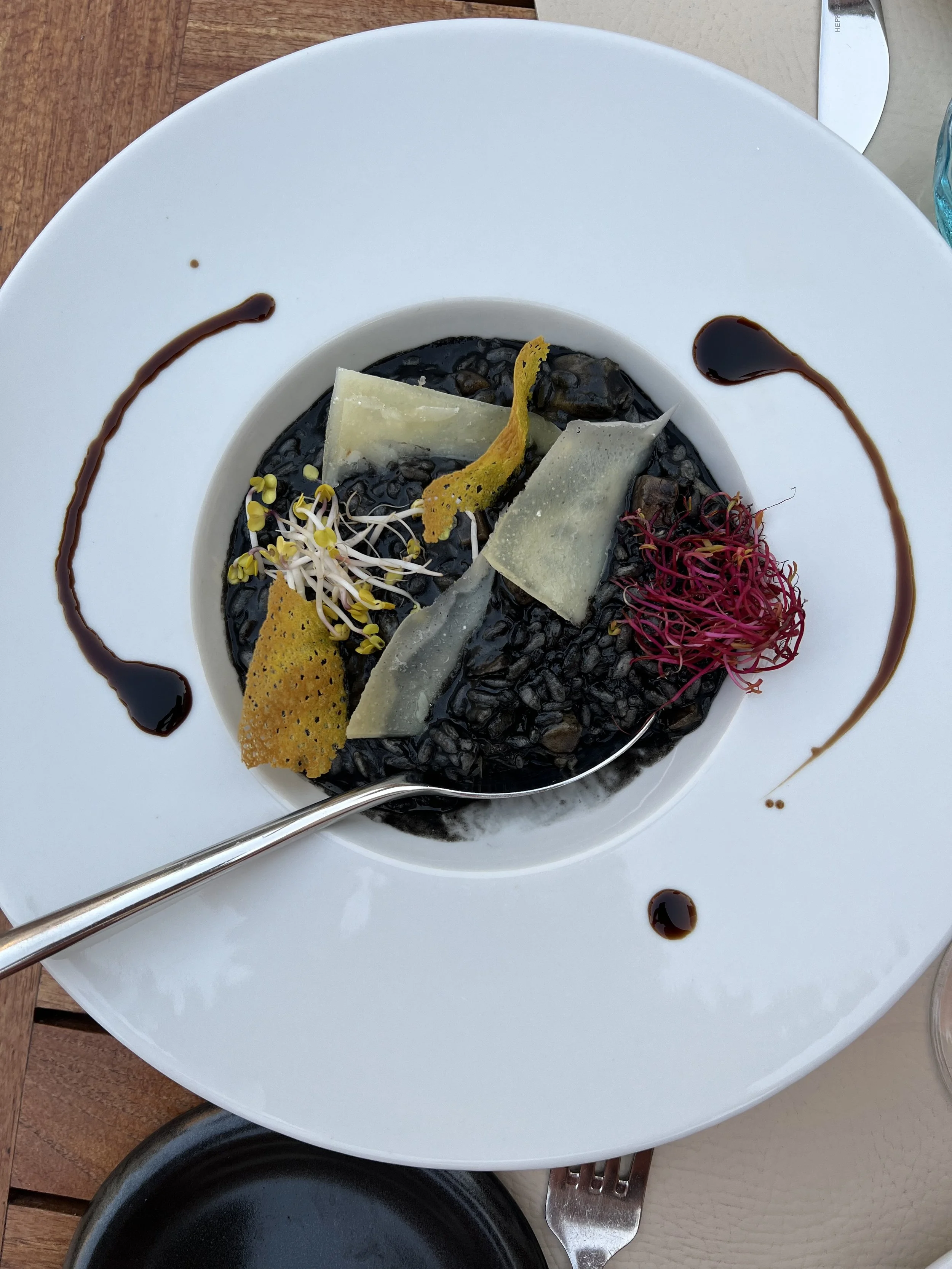 She was curious about Black Risotto and had a place in mind so we went there and shared that dish and a bottle of wine. It was good but the bread and olive oil were better. I probably would never order it again.