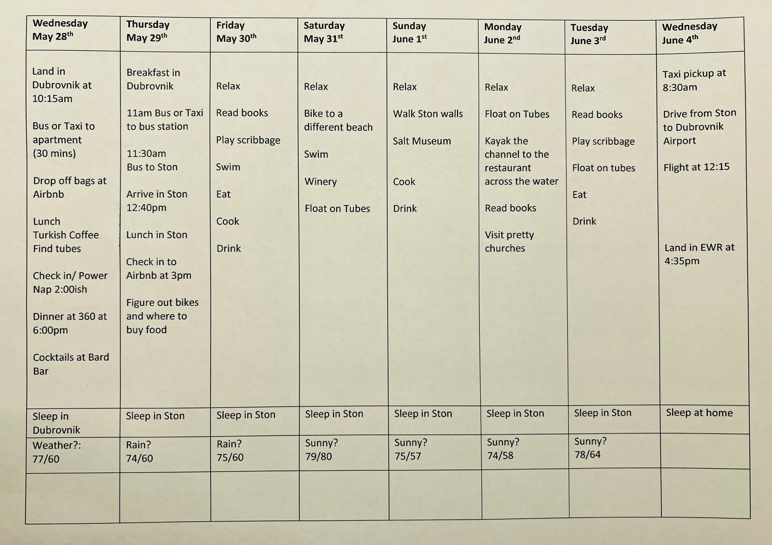 Well up until a few days ago it was looking a bit scary. We spent way too much on flights for it to be cold and rainy. And last week it was barely hitting 70 in Ston. Thankfully we are powerful manifesters and we have manifested sun and heat. The weather looks absolutely perfect!
