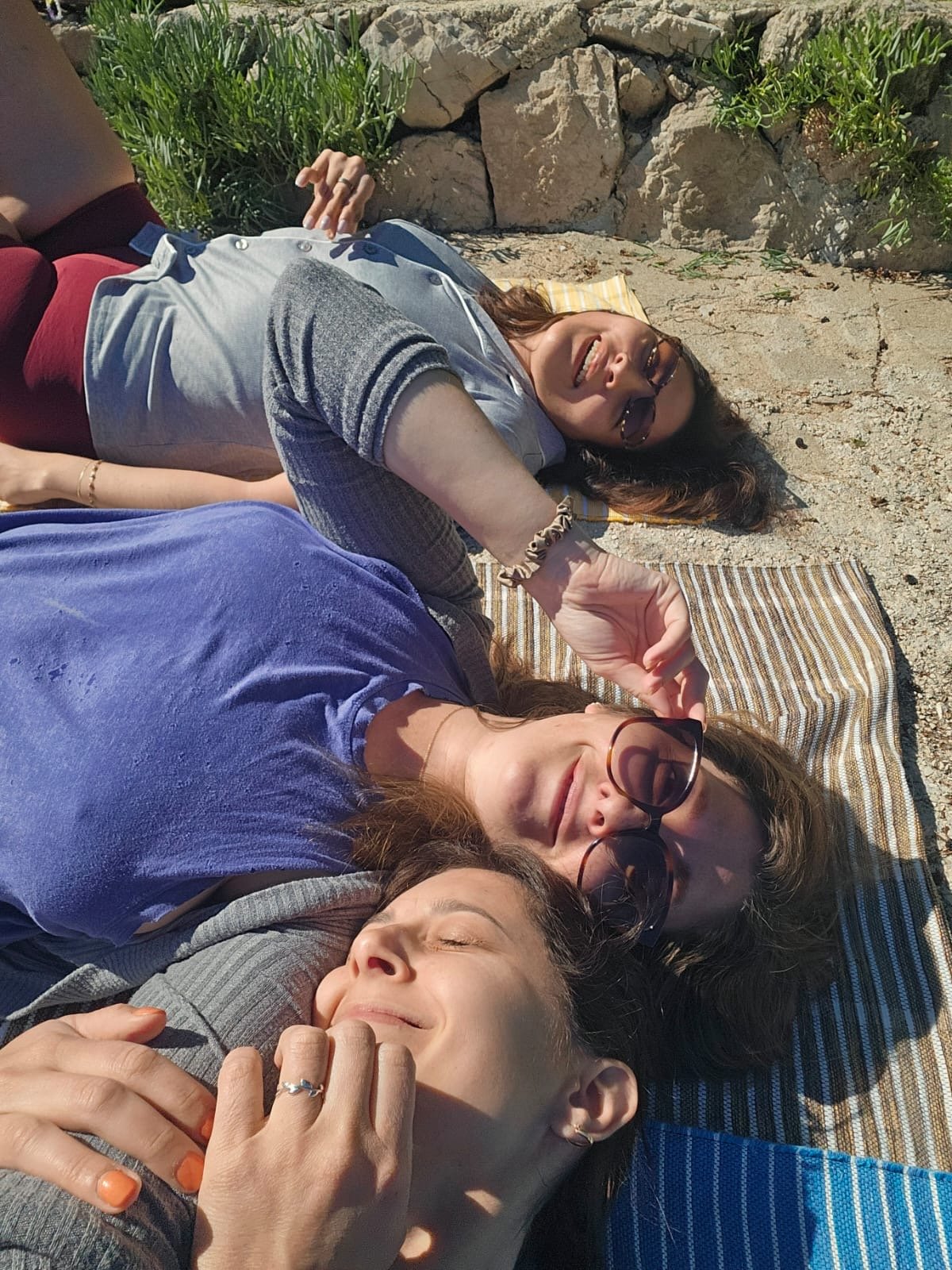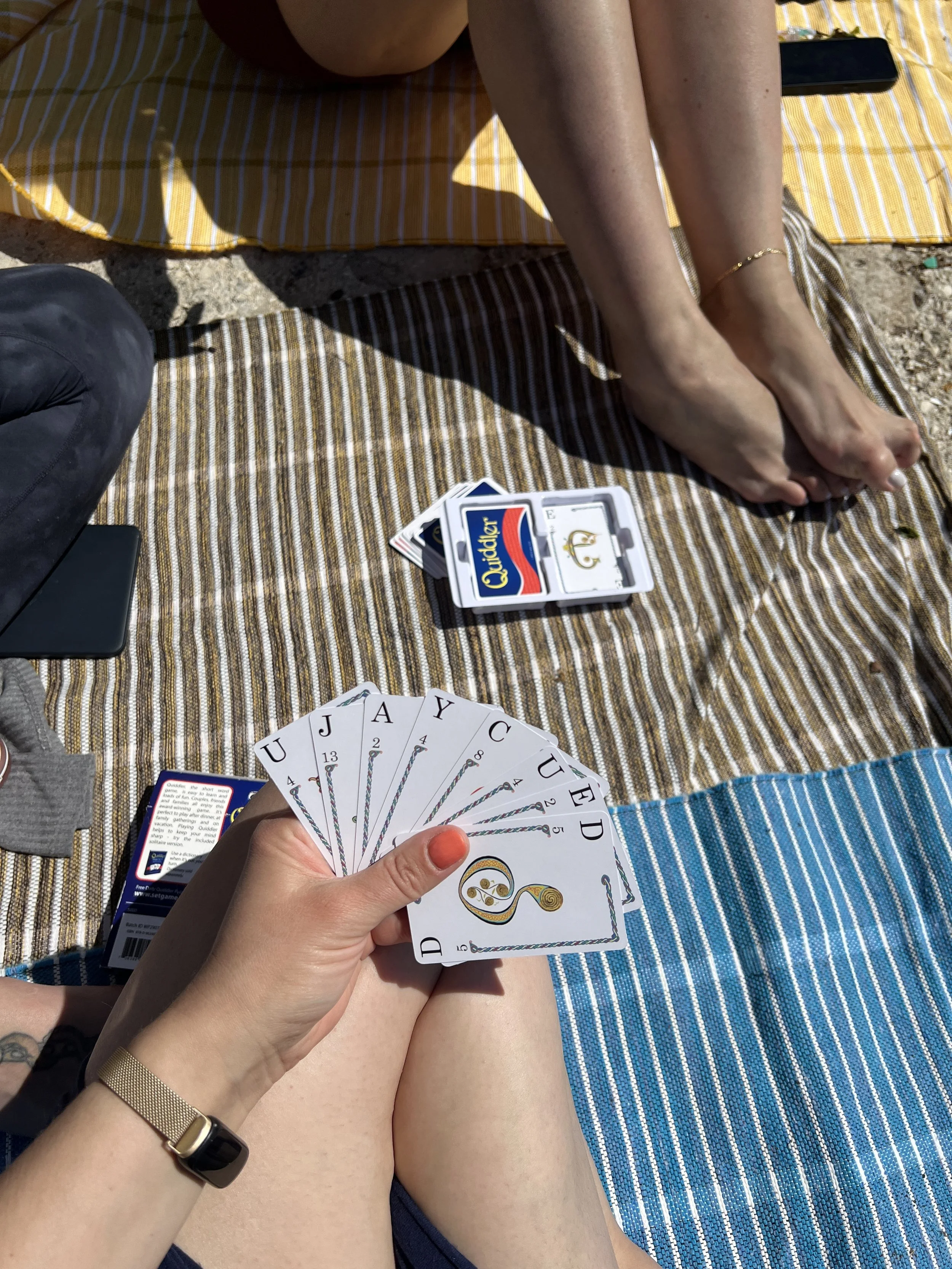 We took our coffees and mats down to the water with a card game (quiddler!) and spent some chill time on the rocks. Fun, but so many big flying beetle bugs.