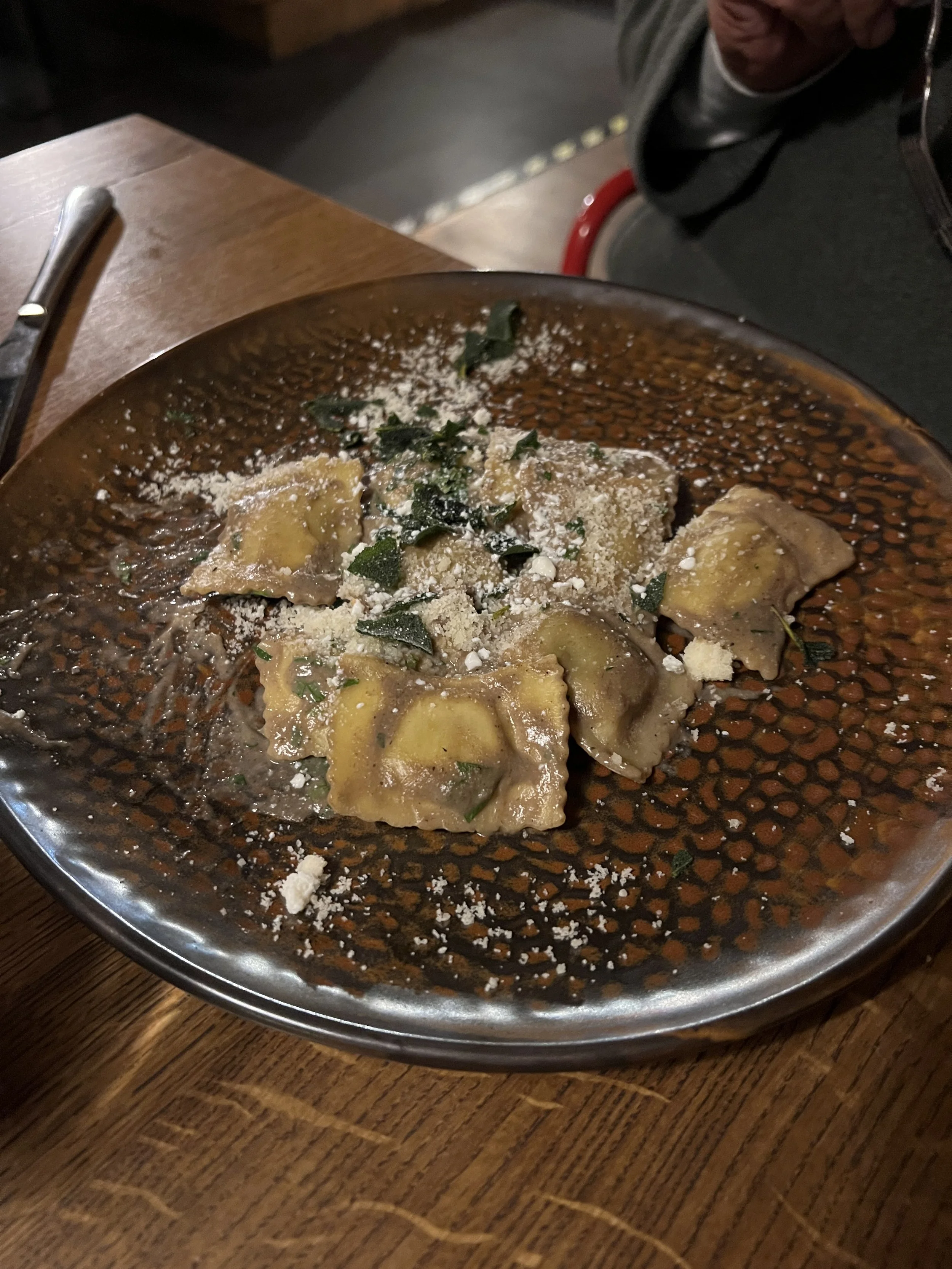 Then Alyssa had a Gorgonzola pasta, Chris had Pumpkin Arancini, Aunt Mare had a plain pizza, Johnny has mushroom ravioli, and I had a Picante pizza with spicy salami and pumpkin and onions.