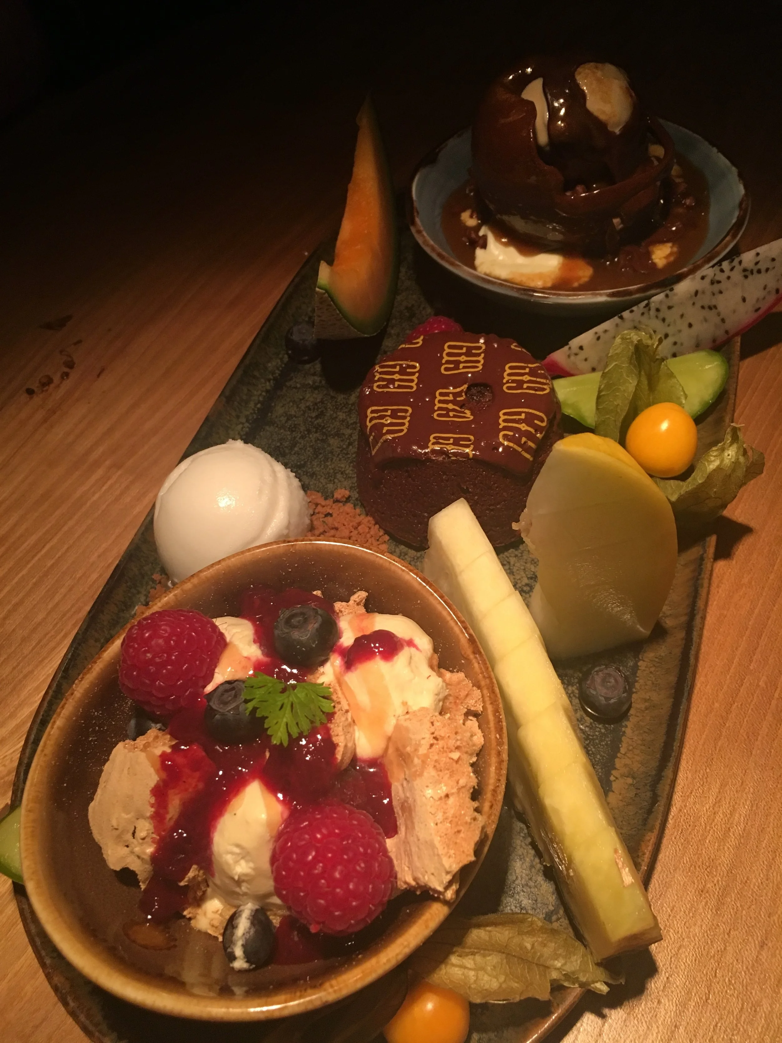We saw a table next to us receive a huge dessert sampler and for ten minutes after the last course we waited in anticipation watching every waiter who walked by hoping it would be our turn. The coolest part of dessert was the chocolate ball—the waiter pours a hot caramel sauce on top of it that melts the chocolate and reveals a ball of coffee ice cream on the inside. This was my favorite and I was so damn excited to get a video of this!