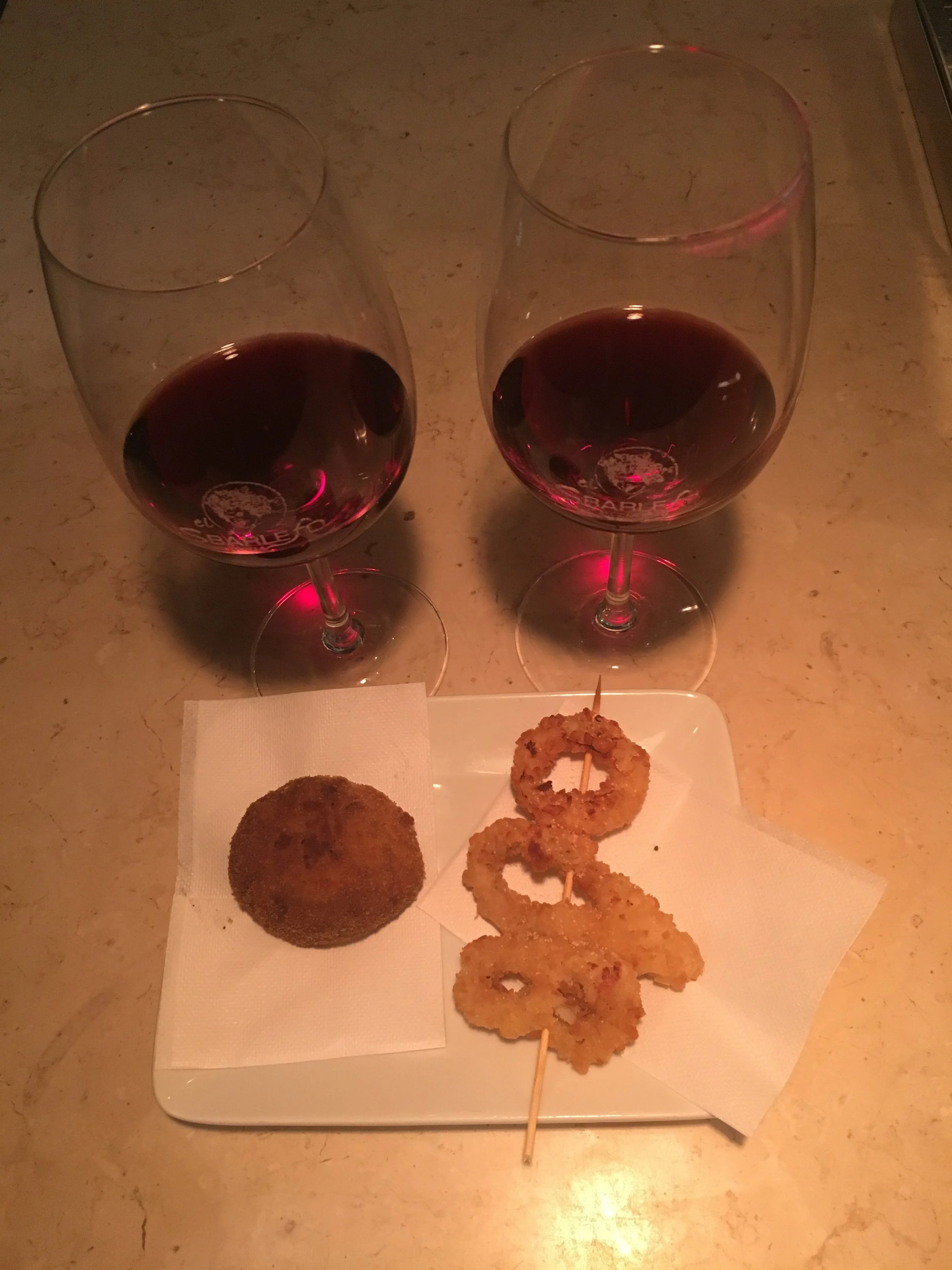 We took a long walk before the next bar. We were heading to a bar that the B&B owner recommended but when we arrived there it seemed to be way too popular for us. There was a swarm of people inside and outside eating and drinking and it was very loud. We thought it might lighten up on the walk back but people were arguing over food outside. Even though it looked good, we continued on to a small place that was practically empty. Adam ordered here as I was somewhat full. One piece was like a jalapeño popper and the other was another fried meatball. Adam didn't like the jalapeño but I actually enjoyed it. Small glasses of wine were good...all this wine and neither one of us was any more than a tiny bit buzzed. Cost: 4 euro