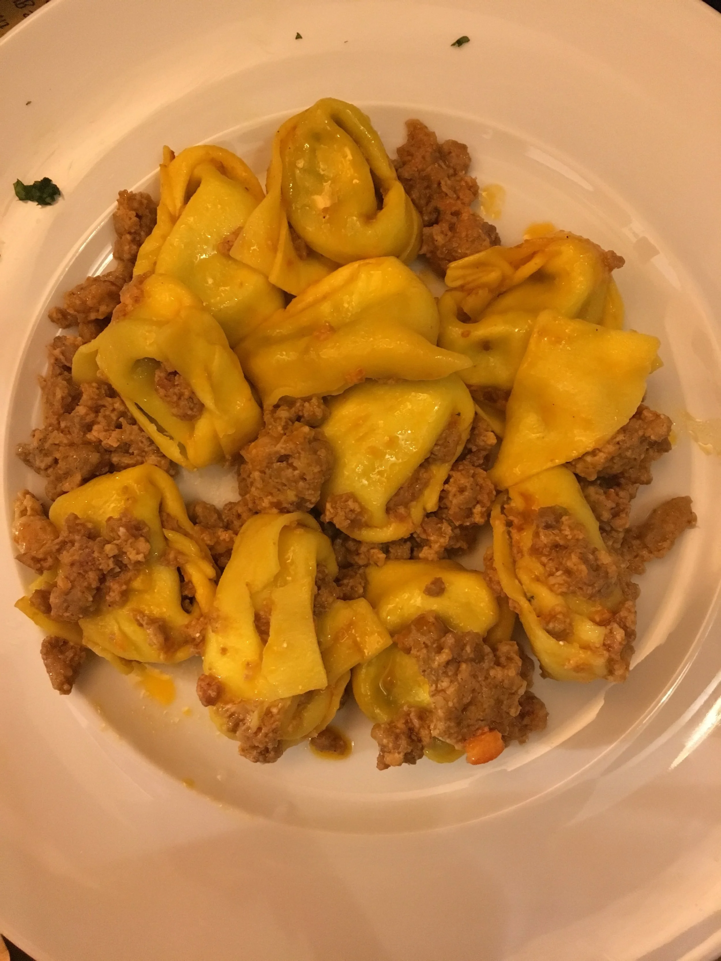 The store itself was charming with displays of meats and cheeses and pasta all around us. We sat upstairs in a quiet table surrounded by wine bottles because the outside was full. Even the little paper plates they served us on were cute... Just seeing other people's plates had us so excited for our meat and cheese to come. We ordered Speck, Truffle Salami, and Pancetta with two different cheeses (one was goat cheese but we don't remember the other one) and also Torellini Bolognese because I assume bolognese comes from bologna?