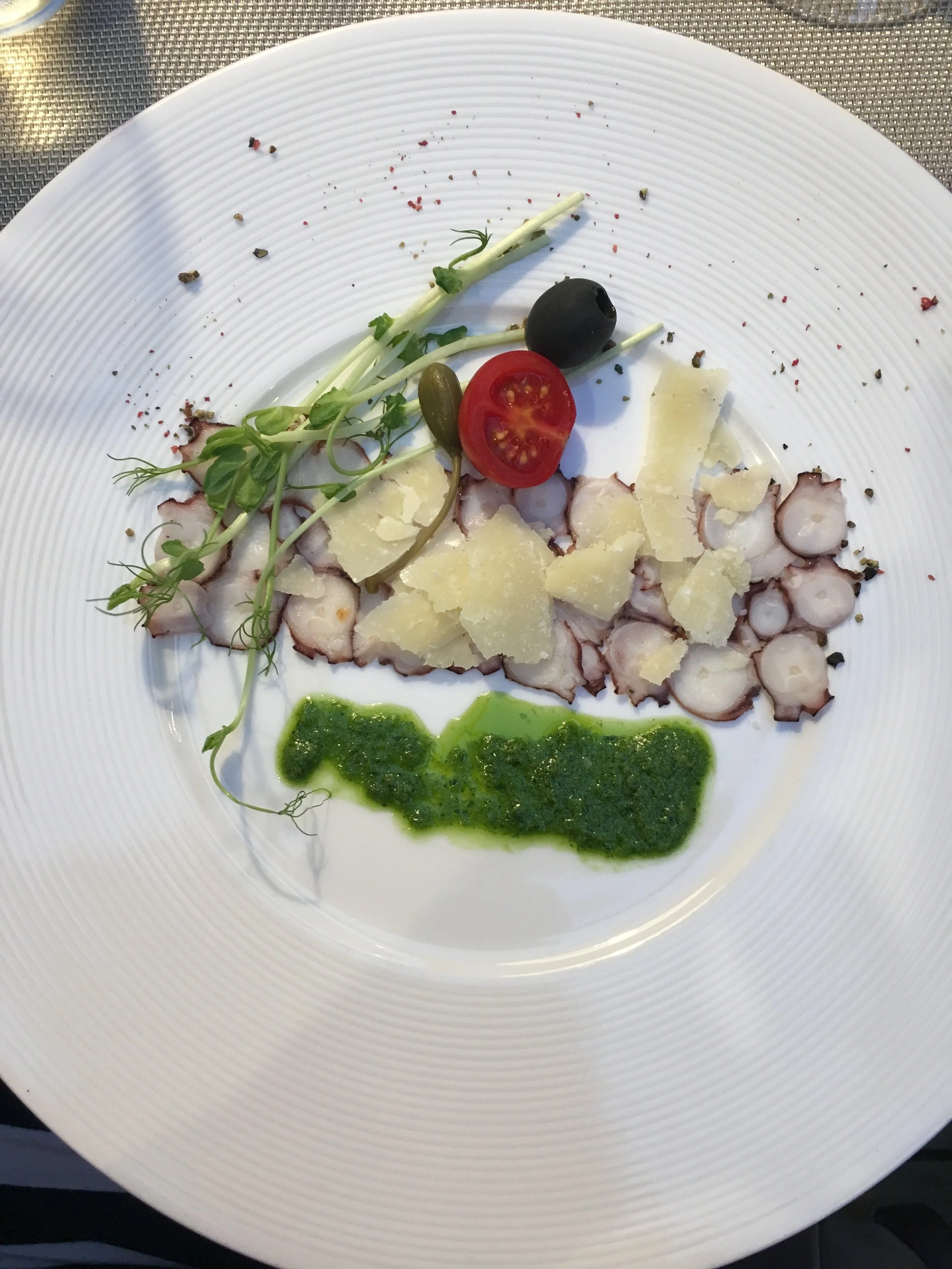 I had an Octupus Carpaccio to start. I tried octopus for the first time in Barcelona about two years ago and I didn't love it. Since then, I've had octupus maybe 5 times and have come to really enjoy the flavor and I'm more accustomed to the texture.