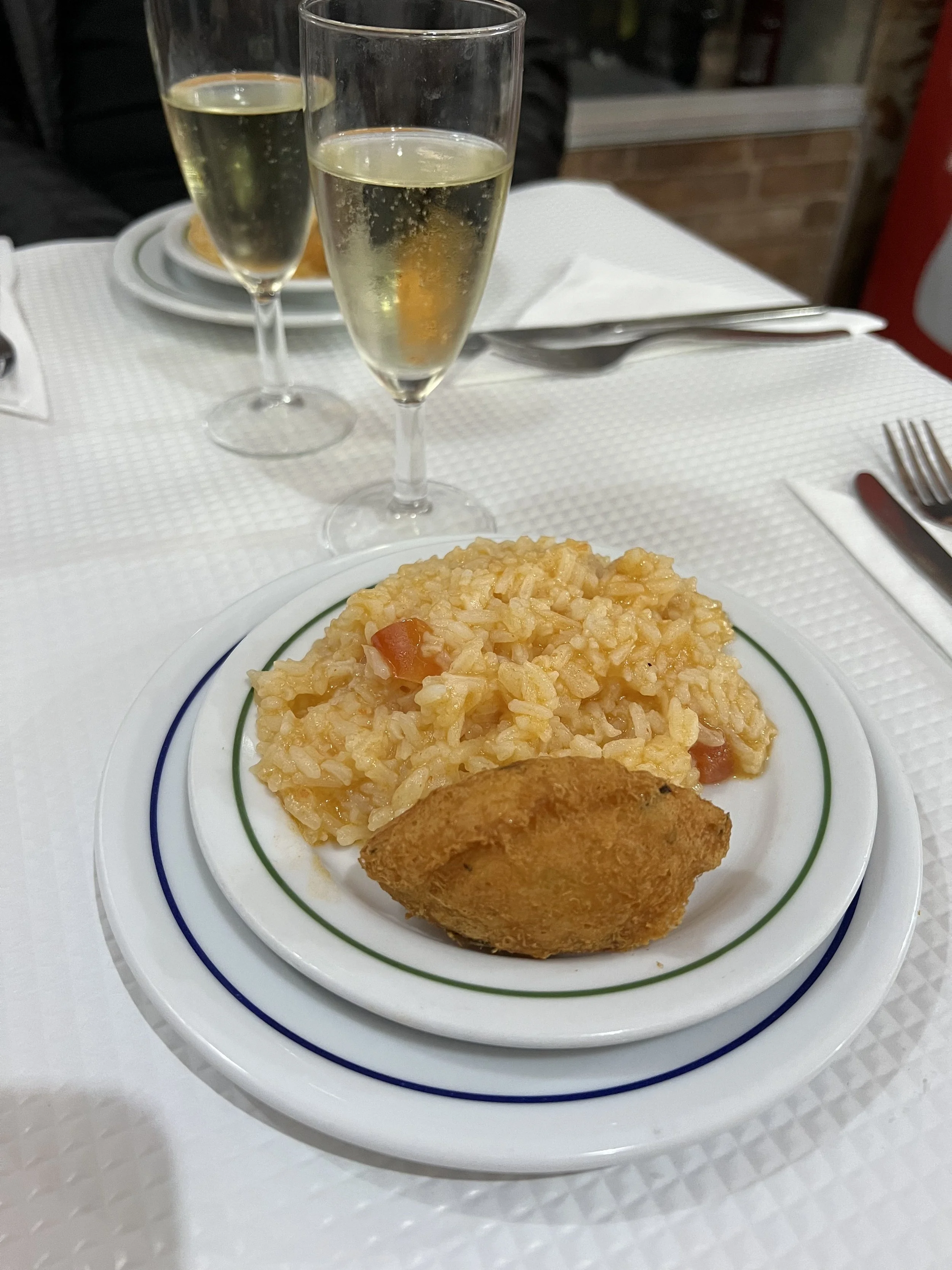 Next stop we get to try a cod fish cake with tomato rice. The salted cod that they use here comes salted and dried and then they soak them in water for 24 hours or more depending on how thick the fish is. This tapa is the cod fish mixed with mashed potato and deep fried. This was accompanied by a rice that was in a watery tomato broth and a glass of vinho verde.