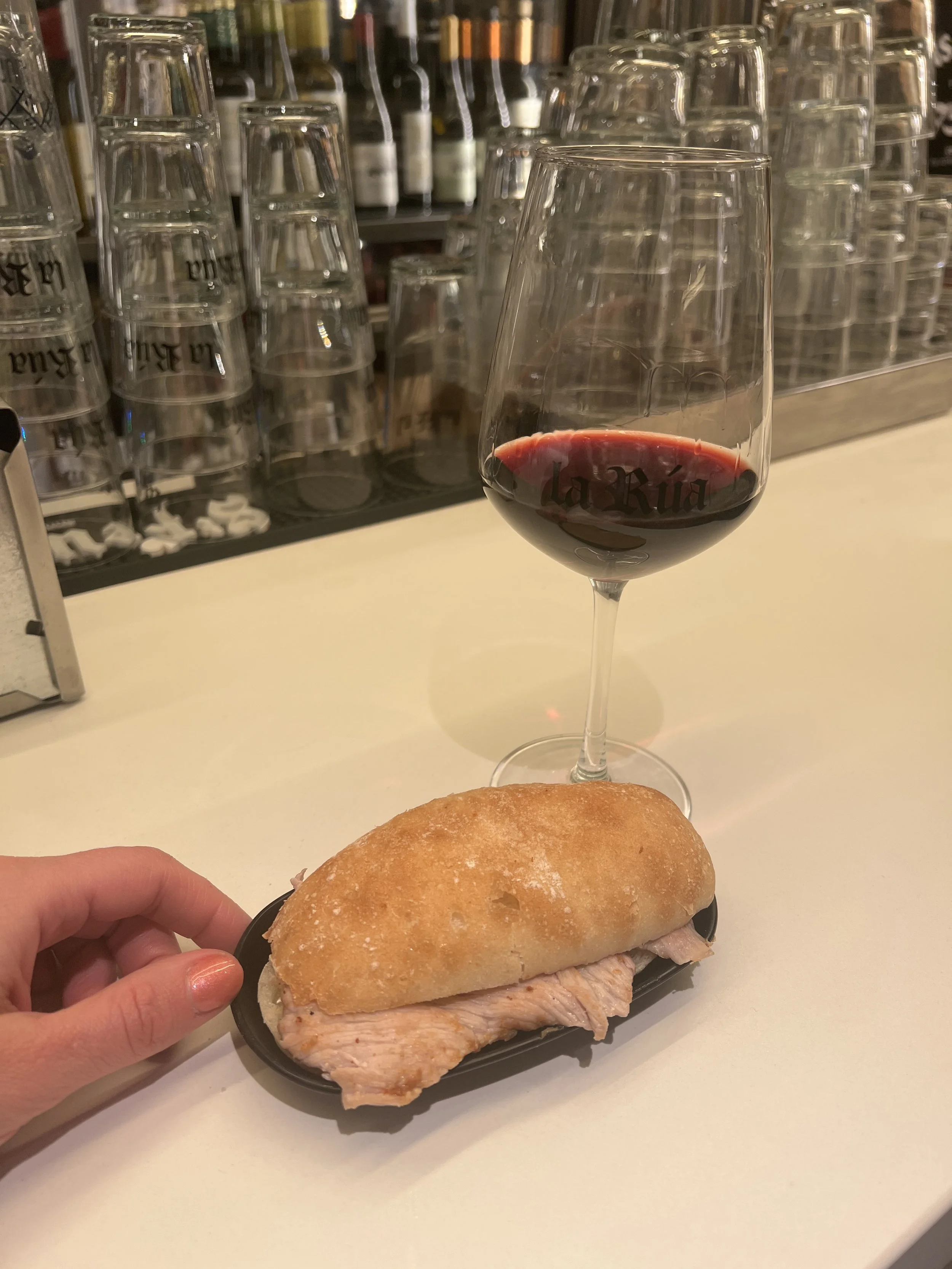 Next we stopped at a spot with many wine options and had a sandwich called “secret iberico”. I was pretty drunk at this point (from one Negroni and half a glass of wine?) so my Spanish greatly improved. This sandwich was pretty awesome—the bread was super soft and there was Brie cheese under the meat. (€7)