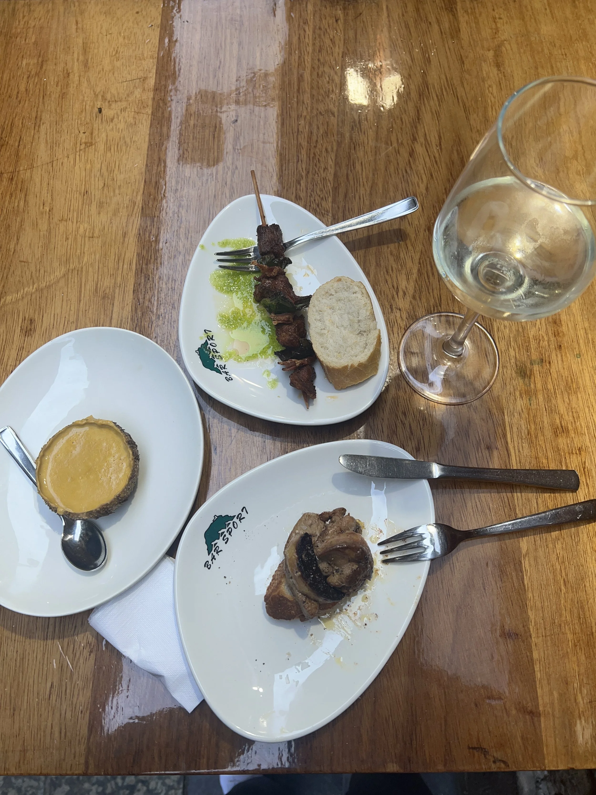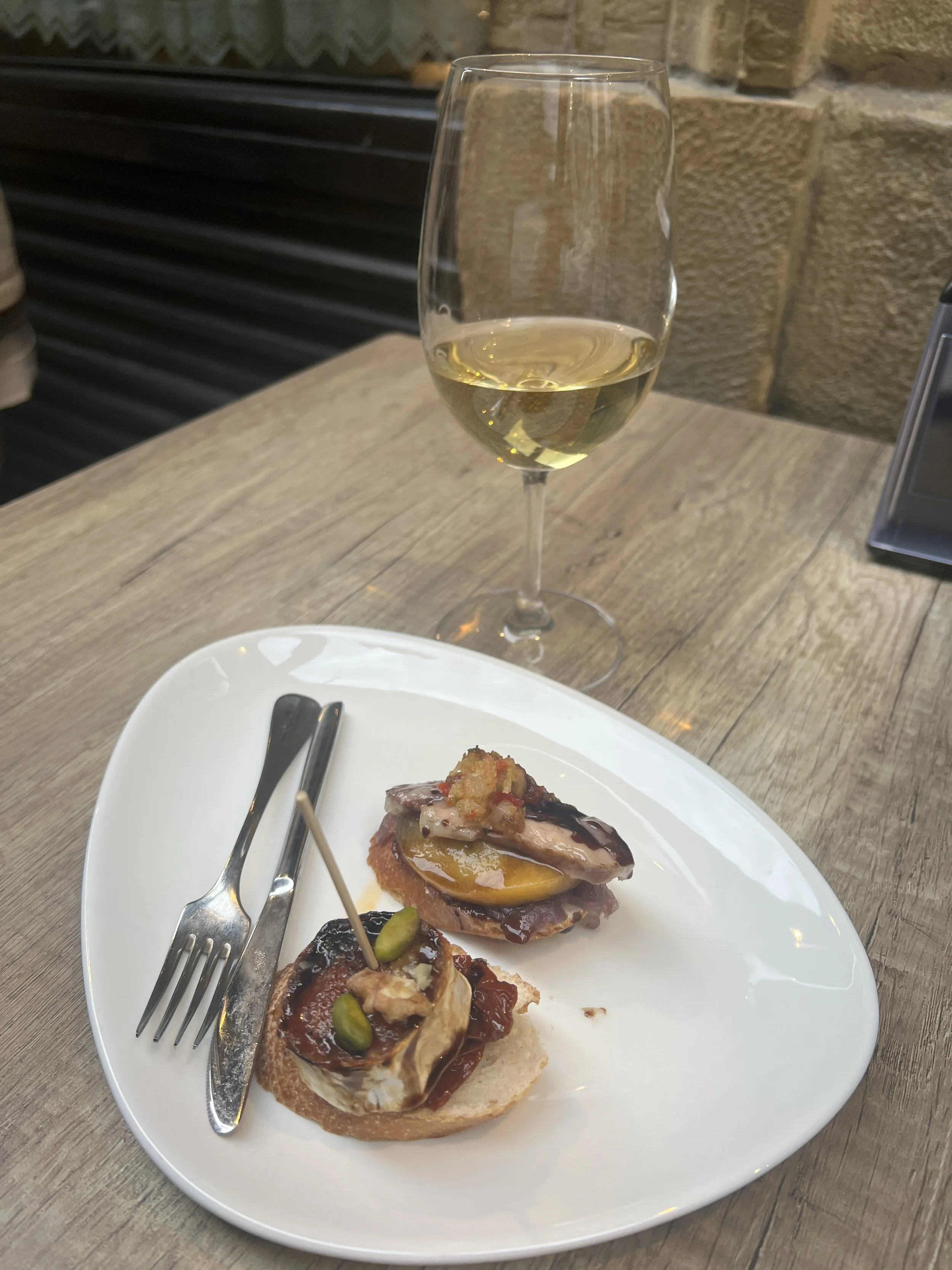 This one I had seen online also. Foie gras on toast, a meat skewer, and sea urchin soup! I hate sea urchin but supposedly this was good? At least in soup form it takes away the nasty texture. It tasted almost like lobster bisque except that it was sea urchin. One bite was enough for me. Foie is hard to mess up and I’m loving that we can eat it at nearly every bar for like €3. Phil starting to look more red and itchy so we decide to walk a bit and maybe walk it off?