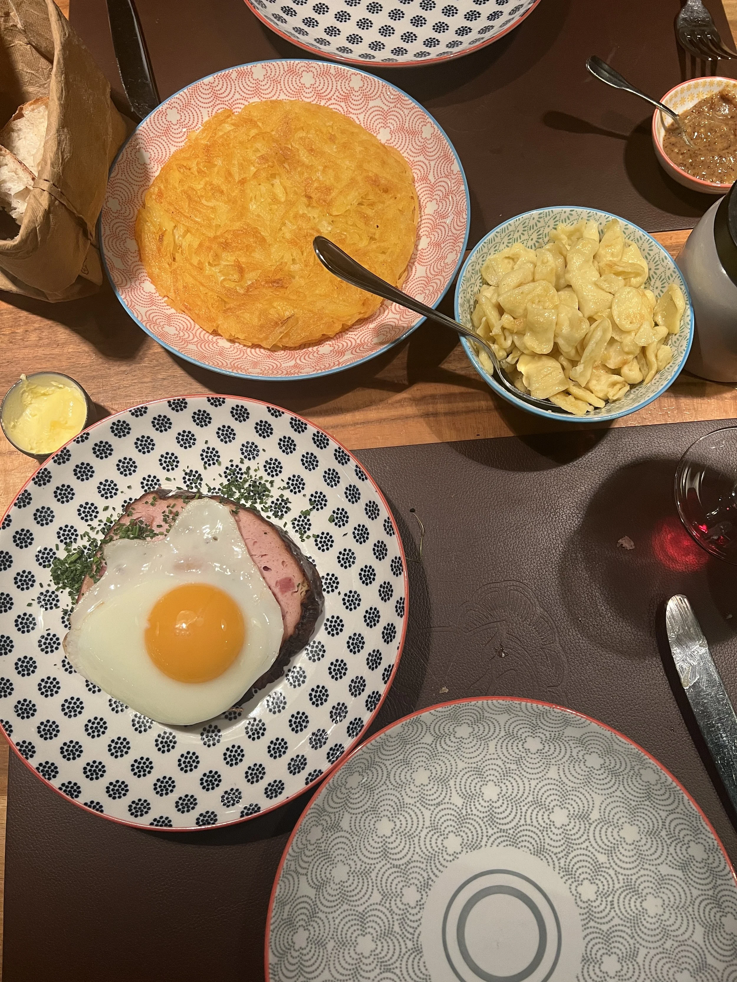 Course 2 was awesome. The spatzle was good, the pork meatloaf dish with the egg was yummy, and the rosti was amazing. We loved it so much that we took the food back with us! Breakfast for tomorrow included in dinner price…winning Switzerland on a budget.